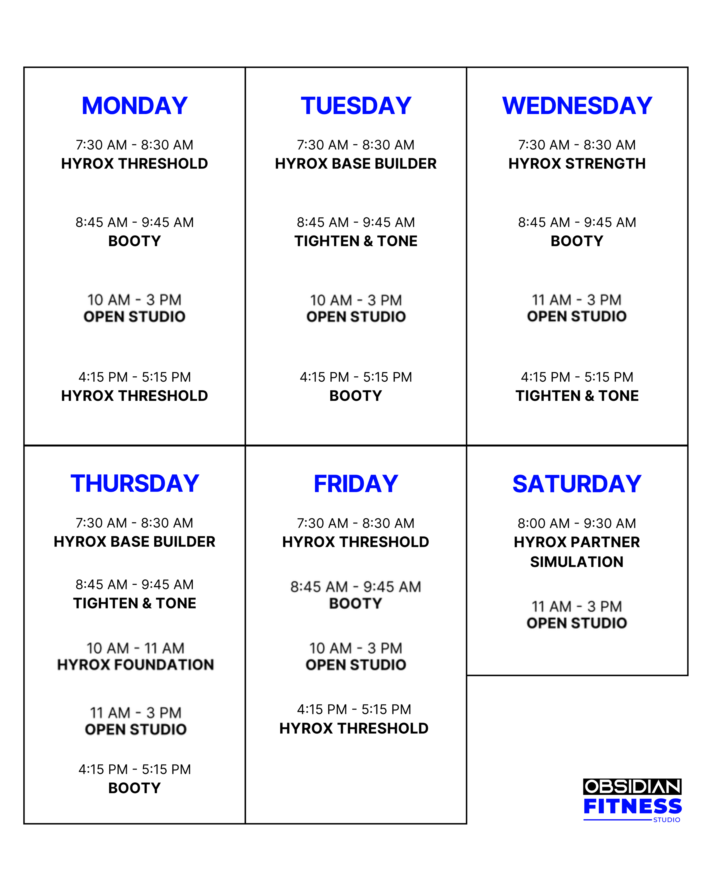 OBSIDIANFITNESS STUDIO HYROX Heart-Rate | Strength | Foundation | Partner Simulation booty shred & sculpt tighten & tone schedule price Book Classes For booking Studio Shoot please contact us +1 847 800 6283 location Google Maps Location Supported with Myzone Switch MORE ABOUT myzone switch